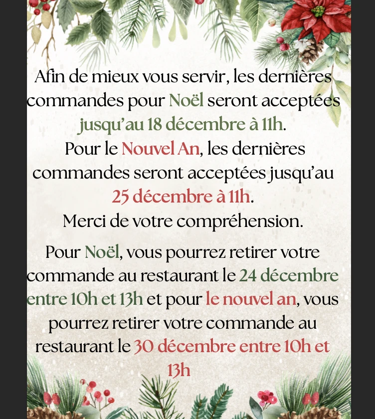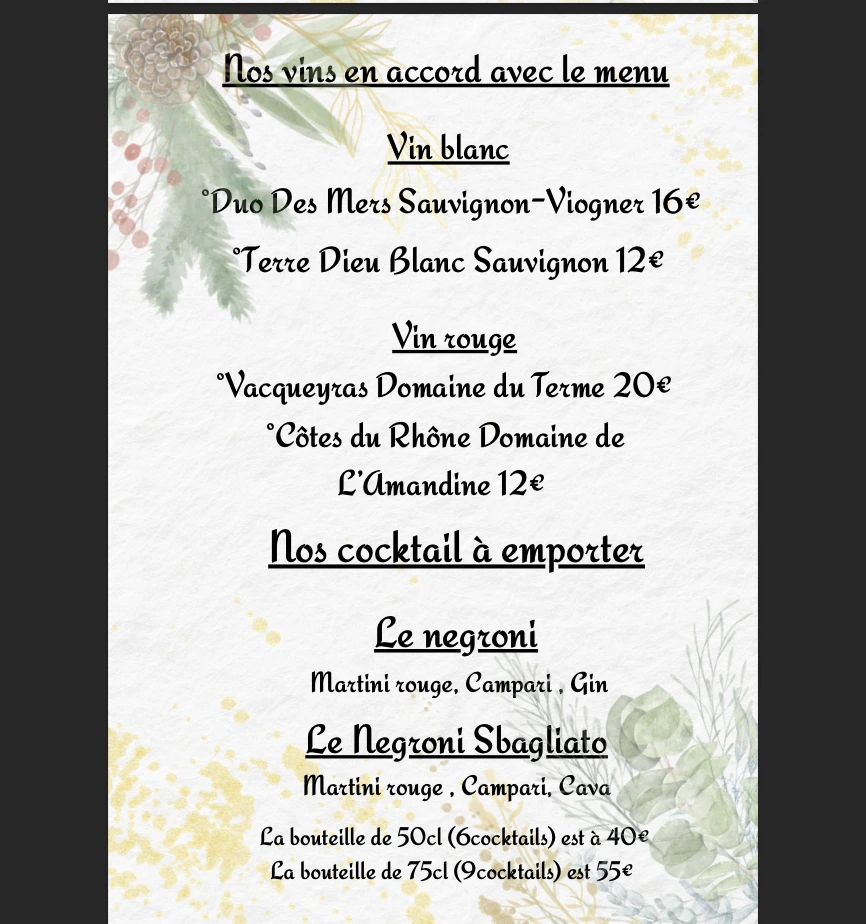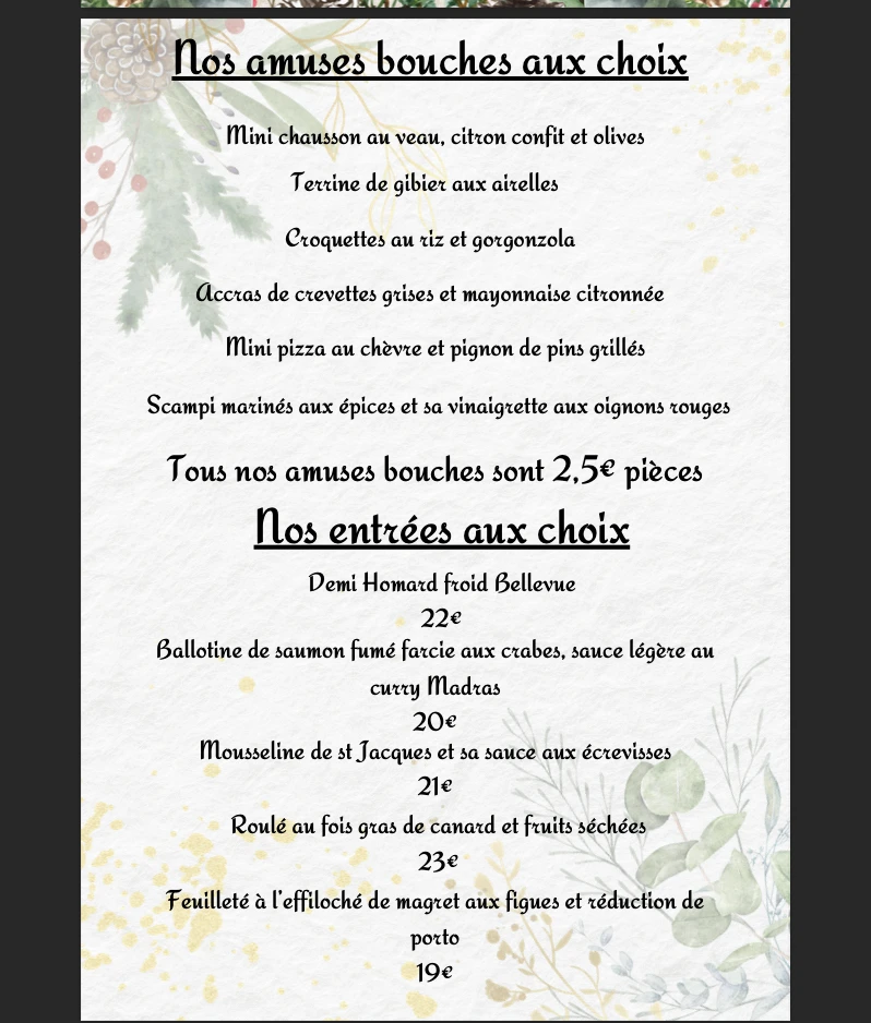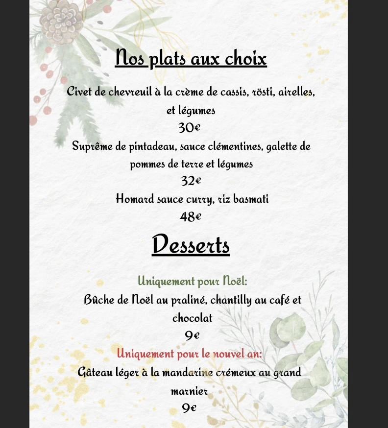 Nous pouvons vous proposer un menu sur mesure (entrée-plat-dessert ou plat-dessert) en fonction de votre budget.