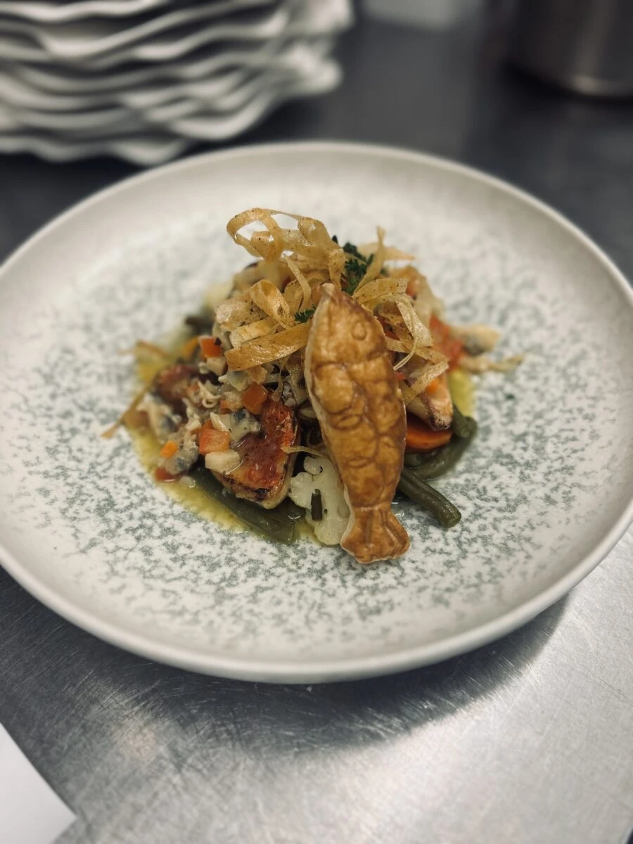 - Filet de st pierre à l’ arôme de sapin, mosaïque de légumes et tagliatelles vertes