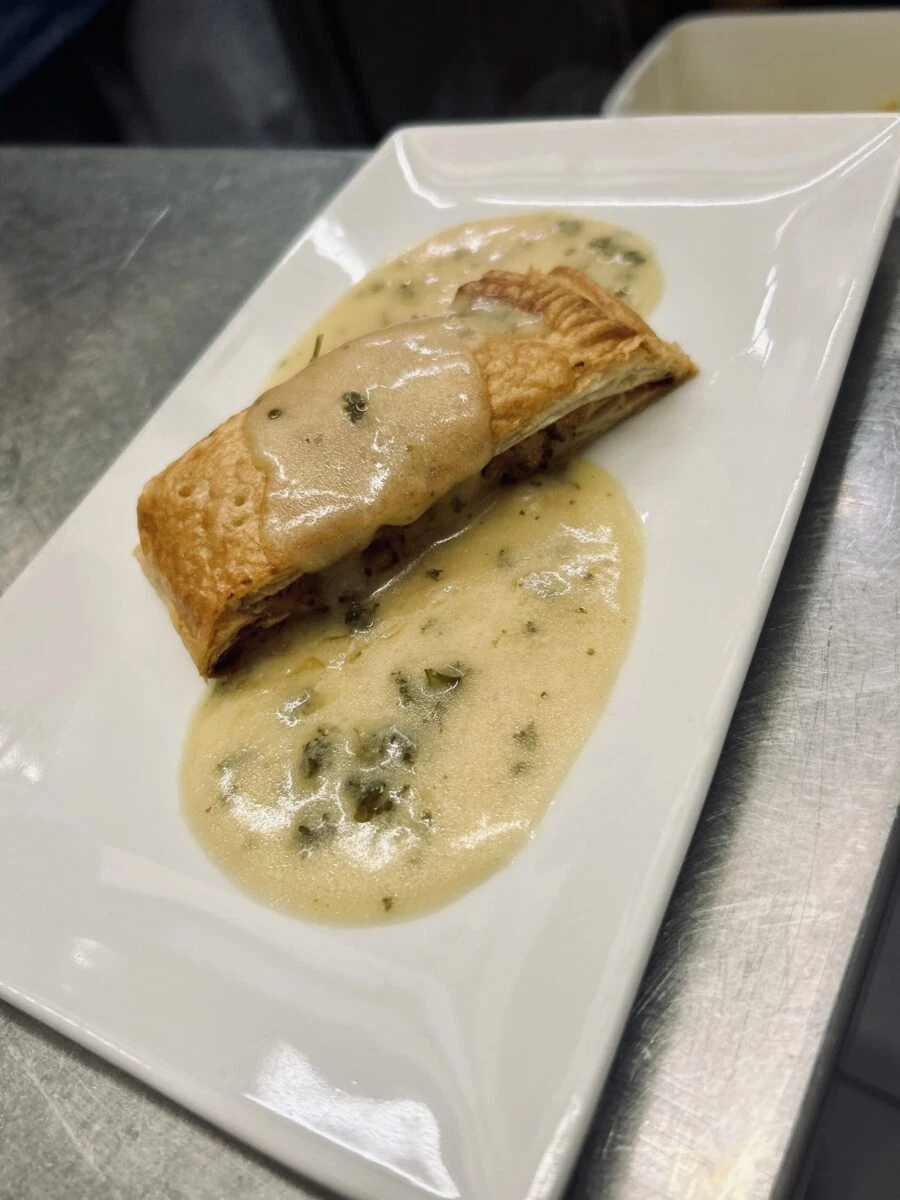 Feuilleté de veau au citron vert, olives, sauce à la citronnelle et crème